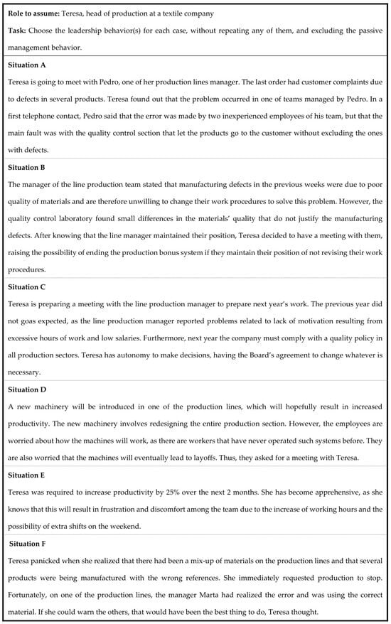 After exploring leadership styles and behaviors, participants are asked to reflect on a case study of leadership behaviors in a specific human context. The case study presents six different situations that can hypothetically occur within a work environment. Groups must discuss and select the leadership behaviors most suitable for each situation. Afterward, all groups share and justify their choice with practitioners. Figure 4 illustrates situations for this task, based on work organization. Versions of this case study are also available for sports organizations, educational organizations, health organizations, and security forces organizations. During training, each group selects the version that is most closely related to their professional experience.