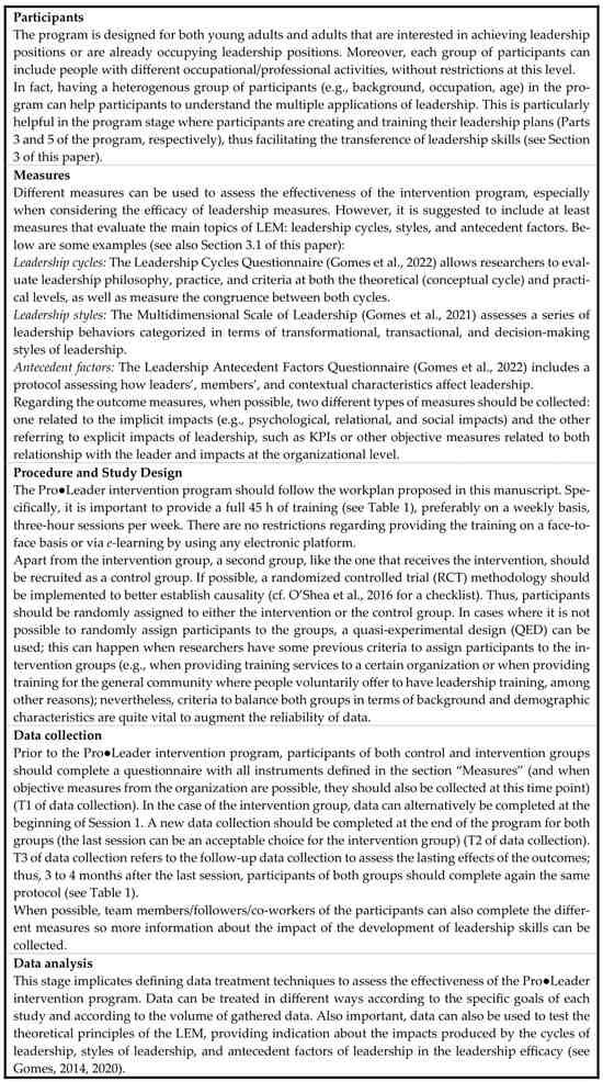 The Pro●Leader intervention program is a leadership training program based on the Leadership Efficacy Model that takes a comprehensive approach to leadership, aiming to respond to some of the recurrent criticism of leadership development programs. Specifically, its innovation relies on the fact that the whole program is centered on the formulation of a leadership plan, which is individualized for each participant, considering their own needs (contradicting the “one size fits all” approach). The formulation of an individual leadership plan implies that participants consider deeply their beliefs, feelings, and assumptions about leadership behaviors when formulating their leadership cycles, which increases the likelihood of change. Moreover, in this process, participants learn different behaviors that can be used to enhance leadership efficacy and adapt to their own circumstances and skills. A third important feature of this intervention program is that it challenges participants to deeply consider the environment in which they expect to exert leadership, namely the characteristics of their followers and organizations, to maximize their efficacy as leaders. Finally, because the program is designed to include the four levels of life skill acquisition (motivation, learning, automatization, and transference), and it does not focus on specific leadership skills but on the process of thinking and developing leadership itself, we believe participants will be more equipped to transfer the knowledge to different contexts, adapting to new situations and organizations (by adapting their individual plans). Of course, as with other programs, the Pro●Leader intervention program assumes a choice about the number of factors that explain the leadership efficacy (leadership cycles, leadership styles, and antecedent factors of leadership), meaning that participants are trained to learn and assume the leadership skills based upon these factors, which does not mean that other factors can adaptively influence leadership. Also of importance, this paper proposes a step-by-step intervention that can help to develop the leadership skills of an interested audience whilst recognizing it is now necessary to collect data to test the effectiveness of the Pro●Leader program.