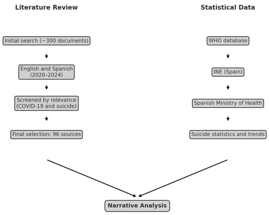 The present study is based on a narrative literature review (NLR) and official statistical data. The literature search included approximately 300 documents published between 2020 and 2024 in English and Spanish that focus on the relationship between suicide and the COVID-19 pandemic (see Figure 1). After screening for relevance, 96 sources were selected for the final analysis. In parallel, statistical data were obtained from official sources, including the World Health Organization (WHO), the Spanish National Institute of Statistics (INE), and the Ministry of Health (Spain). Both data streams were combined in an integrated narrative analysis.
