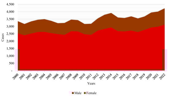 Thus, in line with historic global trends, there are more deaths by suicide among men than among women recorded every year (see Figure 4). Although the numbers for both genders seem to follow a parallel trend, there are variations in the gap between the two. The gap seems to remain the same or even increase slightly over time, indicating that suicide risk factors are affecting men to a greater extent or that men are less likely to seek or receive help for mental health problems (Houle et al., 2008; Keohane & Richardson, 2018; Shi et al., 2021).