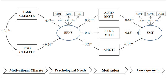 (a) A strong positive correlation (β = 0.47) was observed between the task-involving climate and basic psychological needs, whereas a small-to-moderate negative correlation (β = −0.24) was identified between the ego-involving climate and basic psychological needs.