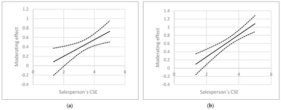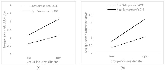 Table 7 presents the positive moderating effect of a salesperson’s CSE. When salespeople with higher CSE perceive a group-inclusive climate, felt obligation (β = 0.176, p < 0.01) and career initiative (β = 0.270, p < 0.001) can be significantly enhanced; thus, Hypothesis 6(a) and Hypothesis 6(b) are valid. Figure 2 presents the interaction graphs with the mean of the regulating variable plus or minus one standard deviation.