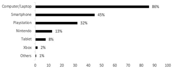 Regarding the devices most used, Figure 1 shows that the vast majority prefer to use a computer/laptop (n = 923, 86.0%), as well as a smartphone (n = 483, 45.0%) and a PlayStation (n = 343, 32.0%). As for the number of electronic devices used individually by each student gamer, we found that 436 (40.6%) use just one device, 406 (37.8%) use two devices and 175 (16.3%) use three devices. Only a small minority use four or more devices (n = 57, 5.3%).
