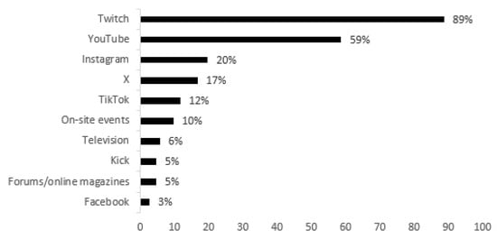 The phenomenon of esports has evolved globally in such a way that it attracts many spectators to its digital and in-person broadcasts, generating massive audiences that increase year on year (). Of the gamers surveyed, more than half (54.0%) said that they watch or follow esports on at least seven different digital platforms. Although it is possible to watch live content on all of them, the video/live-streaming platforms Twitch and YouTube are the ones most used by students, and, as expected (), with a clear dominance of the former (89.0%). It should be noted that only a small proportion (10.0%) usually go to face-to-face events to watch esports. Television also accounts for few users, confirming the importance of digital platforms, especially live-streaming platforms (), to the detriment of this classic means of communication when it comes to consuming competitive gaming ().