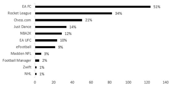 Finally, and in a context more associated with esports in the Sport Games and Racing Games category, Figure 3 shows that, of the 243 student gamers who expressed an interest in wanting to take part in Sports Games competitions at university, these participants mainly want to play EA FC (n = 124, 51.0%), Rocket League (n = 83, 34.0%), Chess.com (n = 51, 21.0%), Just Dance (n = 34, 14.0%) and NBA2K (n = 29, 12.0%). When the differences between gender groups are analyzed, male gamers have a greater preference for EA FC (n = 118, 24.9%) and Rocket League (n = 72, 15.1%), while most female gamers prefer Just Dance (n = 22, 21.6%).