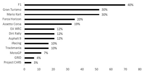 As for student gamers who want to play Racing Games at university (n = 174), Figure 4 shows that their preference is mainly for F1 (n = 70, 40.0%), followed by Gran Turismo (n = 52, 30.0%), Mario Kart (n = 52, 30.0%), Forza Horizon (n = 35, 20.0%) and Assetto Corsa (n = 33, 19.0%). When the differences between gender are analyzed, male gamers have a greater preference for F1 (n = 66, 13.4%) and Gran Turismo (n = 41, 8.7%), while most female gamers are divided between Mario Kart (n = 21, 20.6%) and Gran Turismo (n = 11, 10.8%).
