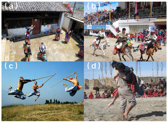 (a) Yunnan Lisu Dudada: a net-separation game somewhat similar to volleyball. (b) Tibet Qiangtang Qiaqing Horse Racing Festival: the largest sports competition event in the northern Tibetan region. (c) Henan Shaolin Kung Fu Chongtian Staff Formation: a staff attack technique used by warrior monks in actual combat. (d) Xinjiang Qelixi: a traditional Uyghur wrestling competition with no age or weight divisions. These photos were obtained from field research.