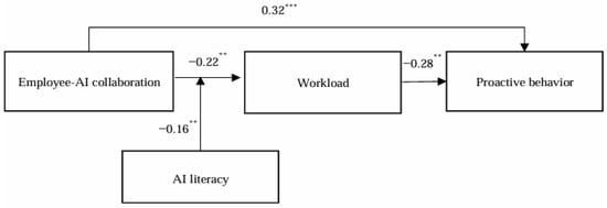 As shown in Figure 2, employee–AI collaboration significantly positively influences proactive behavior (B = 0.32, p < 0.001), supporting H1. In addition, employee–AI collaboration significantly negatively impacts workload (B = −0.22, p < 0.001), and workload significantly negatively influences proactive behavior (B = −0.28, p < 0.001), thus supporting H2 and H3.