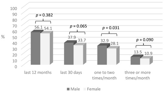 The overall prevalence of last 30 days gambling behaviour was 36.4%, of which 37.9% among males and 33.7% among females (p = 0.065) (Figure 1). A significantly higher proportion of males than females gambled one to two times a month (32.9% vs. 28.1%, p = 0.031).