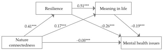 Regression analysis (Table 3 and Figure 2) indicated that nature connectedness had a significant negative effect on resilience (β = 0.41, p < 0.001) and meaning in life (β = 0.17, p < 0.001) and a significant positive effect on mental health issues (β = −0.08, p < 0.001). Additionally, resilience had a significant positive predicted meaning in life (β = 0.51, p < 0.001), and meaning in life exerts a significant negative influence on mental health issues (β = −0.19, p < 0.001).