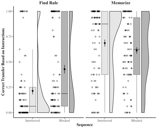 Correct categorization of transfer items as a function of instructed strategy and sequence in Experiment 1. Box plots display the interquartile range (IQR), with the whiskers extending to the minimum and maximum values within 1.5 times the IQR. The black circles within the box plots represent the mean for each cell, with the error bars representing +/−1 SEM. Violin plots depict the density of individual participants’ accuracy scores, with wider sections indicating higher density. Individual participant scores are provided as a scatterplot to the left of the box plots.