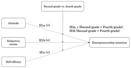 Studies have shown that entrepreneurship education has a negative and significant effect on the relationship between subjective norms and entrepreneurial intention (). Entrepreneurship education helps students acquire the ability to make their own decisions without relying on others’ opinions of others (). Therefore, when students undertake entrepreneurship education, the degree to which subjective norms influence entrepreneurship intentions decreases. Based on the above discussion, we developed the following hypotheses (Figure 1).