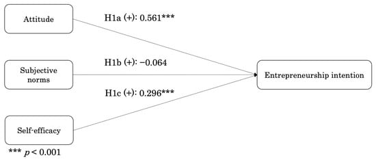 As described in Figure 2, the results of structural equation modeling showed that attitude and self-efficacy have significant and positive effect on entrepreneurship intention (attitude, β = 0.561, p < 0.001; self-efficacy, β = 0.296, p < 0.001). Hence, H1 and H1c were supported. In contrary, subjective norms was found to have no significant effect on entrepreneurship intention (β = −0.064, p > 0.05), implying that the H1b was not supported.