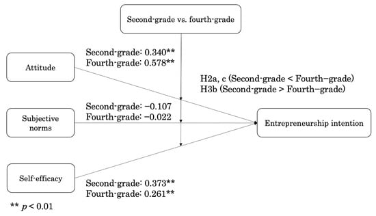 To assess whether the entrepreneurship education influenced attitude and self-efficacy on entrepreneurship intention, a multi-group analysis was conducted. As direct effect of subjective norms on entrepreneurship intention found to have negative and insignificant effect; the current study will further continue to discuss on the attitude and self-efficacy. The chi-square difference test showed that the two different groups were statistically and significantly different for attitude and self-efficacy (p > 0.001). According to the results of the multi-group analysis, the impact of entrepreneurship education on the relationship between attitude and entrepreneurship intention was found to be positive and significant in both second- and fourth-year students. Similarly, the impact of entrepreneurship education on the relationship between self-efficacy and entrepreneurship intention was found to be positive and significant in both grades. These results indicated that as students take entrepreneurship education, their attitude increases while self-efficacy decreases (Figure 3).