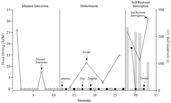 Functional analysis of self-injurious behavior. RPM = responses per minute. Gray bar indicates duration of self-restraint (in seconds).