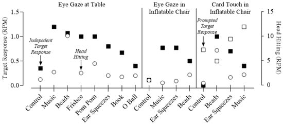 Figure 2 shows the outcomes of our reinforcer assessment, collapsed across 67 sessions total (27 sessions in phase 1; 26 sessions in phase 2; 14 sessions in phase 3; session-by-session data available upon request). When all putative reinforcers and attention were provided noncontingently in the control condition, independent target responding (eye gazing or card touching) occurred at rates of 0.35, 0.11, and 0.00 RPM across respective phases. Self-injury remained relatively low during the control condition, with a rate of 1.15, 1.0, and 0.42 RPM across respective phases. In phase 1, putative reinforcers were provided contingent on eye gazing while Gerard was seated at a table. Target responding occurred at a higher rate than in the control condition (0.35 RPM) when music (1.20 RPM), beads (1.07 RPM), frisbee (1.0 RPM), pom pom (1.0 RPM), ear squeezes (0.8 RPM), book (0.67 RPM), and O-ball (0.40 RPM) were delivered contingent on eye gazing. However, rates of SIB were also higher with all items (range = 1.67–10.06 RPM). In phase 2, putative reinforcers were provided contingent on eye gazing while Gerard was seated in an inflatable chair. The change in seating was an attempt to reduce SIB during the assessment. We included only music, beads, and ear squeezes in this phase; these items were selected based on their strength as reinforcers or their ease of implementation (see extended rationale below). During phase 2, target responding occurred at a higher rate than in the control condition (0.11 RPM) for all three items: music (0.77 RPM), ear squeezes (0.77 RPM), and beads (0.5 RPM). In addition, SIB remained relatively low across the phase (range = 0.47–2.1 RPM). Finally, we increased the effort involved in the target response by prompting a card touch in phase 3. Again, we tested only the music, ear squeezes, and beads in this phase, and they again produced independent target responding at higher levels than the control (control = 0.0 RPM, beads = 1.0 RPM, iPad = 0.4 RPM, ear squeezes = 0.7 RPM). In addition, prompted responses occurred at a higher rate when music and ear squeezes were delivered. However, SIB occurred at a higher rate (range = 1.58–7.11 RPM) during the test conditions of this phase compared to the control (0.42 RPM).