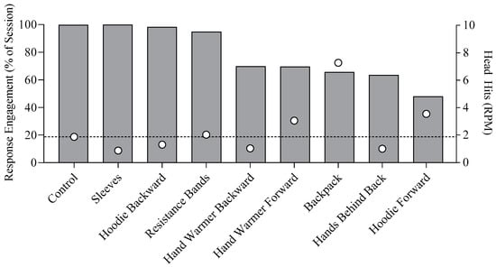 Figure 3 shows the outcomes of our ASRA, collapsed across sessions (10 sessions of control, 3 sessions of sleeves, 7 sessions of hoodie backward, 15 sessions of resistance bands, 9 sessions of hand warmer backward, 11 sessions of hand warmer forward, 10 sessions of backpack, 3 sessions of hands behind back, and 11 sessions of hoodie forward; session-by-session data available upon request). When the wrist cuffs were used (control), SIB occurred at a rate of 1.87 RPM, and engagement was 99.8%2. Other items assessed included the compression sleeves, hoodie backward, resistance bands, hand warmer backward, hand warmer forward, backpack, hands behind the back, and hoodie forward, which produced engagement at 100%, 98.3%, 94.9%, 69.8%, 69.7%, 65.7%, 63.4%, and 48.2%, respectively. SIB occurred at a rate of 1.87 RPM in the control condition, where wrist cuffs drastically inhibited the force of any successful head hit. Several alternative self-restraint items produced SIB rates close to or lower than the rates produced by the cuffs, including sleeves (0.87 RPM), hoodie backward (1.3 RPM), resistance bands (2.03 RPM), hand warmer backward (1.03 RPM), and hands behind back (1.0 RPM). The hand warmer forward was associated with slightly elevated rates of SIB (3.05 RPM), and the backpack was associated with the highest rates of SIB (7.27 RPM). Compared to a condition in which no self-restraint or control items were available (i.e., the control condition of the A-CSA and the self-restraint interruption condition of the FA; see above), however, SIB was reduced across all items included in this assessment.