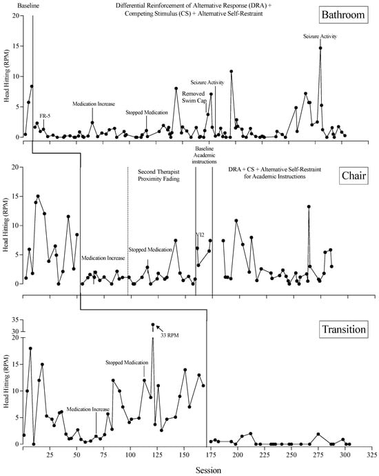 Specific to the transition context, SIB occurred at variable rates during the baseline phase, ending on a slightly increasing trend before the treatment package was introduced. During baseline, an increase in medication on session 68 was perhaps responsible for an increasing trend in SIB, but this effect was not reversed when medication was discontinued on Session 113. An immediate and sustained reduction in SIB occurred following the introduction of the treatment package. No prompts to engage in the alternative self-restraint response occurred in this context.