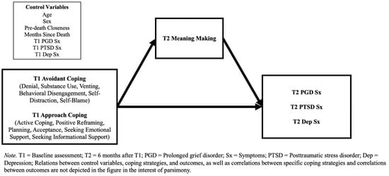 Data analysis occurred in two steps. First, using IBM SPSS Statistics (v29), correlation analyses were conducted to assess the relations among study variables and to inform the inclusion of covariates in subsequent mediation analyses using path analysis. Next, after the review of significant correlation coefficients in the first step, we developed and tested a path model illustrating the mediating role of meaning making in the prospective relationship between avoidant coping strategies, approach coping strategies, and grief-related outcomes (PG, PTS, depression symptom severity). Within this path model, which was created using MPLUS 8, avoidant coping strategies and approach-based coping strategies at T1 were covaried with each other, and both were regressed onto T2 meaning making, T2 PTS and T2 PG symptoms, and T2 depression severity. The proposed mediator, meaning making, was regressed on T2 PTS, T2 PG, and T2 depression severity. The model (see Figure 1) was adjusted for all the mental health outcomes at T1, as well as demographic and loss-related characteristics that were significant in the correlation analysis. To promote parsimony, we assessed the model fit statistics for additional models that reduced the number of demographic and loss-related characteristics. To assess the fit across these models, we utilized the comparative fit index (CFI), the root mean square error of approximation (RMSEA), and the standardized root mean square residual (SRMR). CFI values ≥ 0.95 indicate an excellent fit (Hu & Bentler, 1999), RMSEA values ≤ 0.05 indicate an approximate fit (Browne & Cudeck, 1992), and SRMR values < 0.08 indicate a good fit (Hu & Bentler, 1999). To assess direct and indirect effects within the proposed model, bias-corrected bootstrapped estimates (Efron & Tibshirani, 1994) were generated based on 10,000 replications. This procedure yielded a robust test of mediation that could account for departures from the assumption of normality (Fritz & MacKinnon, 2007). The statistical significance of indirect effects was assessed using 95% bias-corrected bootstrapped confidence intervals. Models were estimated using full information maximum likelihood estimation (FIML) to account for missing data (0–4% missing; Little et al., 2014).