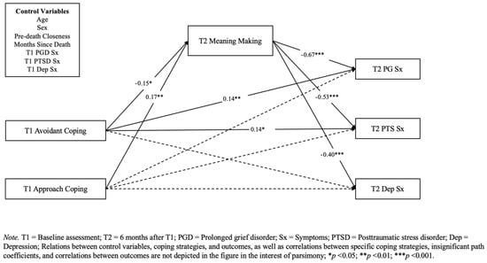 The initial correlation analyses indicated a variety of bivariate relationships among the study variables (see Table 2). Among the loss-related characteristics, the months since the loss was significantly related to T2 meaning making (r = 0.20, p < 0.01) and T2 PG (r = −0.14, p < 0.05), T2 PTS (r = −0.20, p < 0.01), and T2 depression symptoms (r = −0.17, p < 0.05). Greater closeness to the decedent was associated with increased T2 PG symptoms (r = 0.15, p < 0.05). The use of avoidant coping strategies at T1 was associated with lower levels of T2 meaning making (r = −0.29, p < 0.01) and higher T2 PG (r = 0.41, p < 0.01), T2 PTS (r = 0.46, p < 0.01), and T2 depression symptoms (r = 0.39, p < 0.01). Conversely, the use of approach-based coping strategies at T1 was associated with higher levels of T2 meaning making (r = 0.21, p < 0.01) and lower T2 PG (r = −0.14, p < 0.05), T2 PTS (r = −0.14, p < 0.05), and T2 depression symptoms (r = −0.16, p < 0.05). When considered together, these patterns of bivariate relations offered preliminary support for the proposed mediation model.