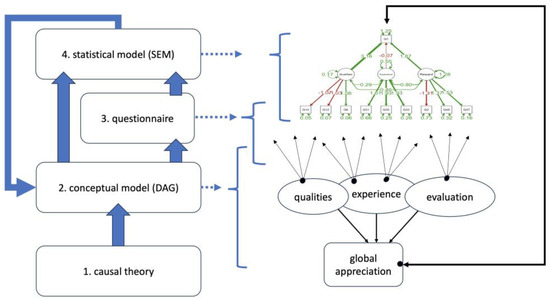 First, we introduce the overall modeling approach. It is based on different iterations in which theory and data analysis are mutually refined, as shown in Figure 1. The causal theory (1) offers insight in terms of the descriptions of mechanisms and dynamics. From that theory, we extract the conceptual model (2) (represented as a Directed Acyclic Graph, or DAG), the questionnaire (3) and the statistical model (4) (represented as a Structural Equation Model, or SEM). The left side of Figure 1 provides a schematic view of how these components are related, while the right side illustrates a DAG and an SEM. They appear as networks of concepts, with questions situated at arrow end points. The DAG and SEM are each other’s mirror, except that the SEM adds the computational tools for statistical analysis, defining the strengths of the connections among concepts. In the iterative process, the DAG, the questionnaire and the SEM are refined until a satisfactory result is obtained that still copes with the causal theory. This iteration uses data from a survey, with the questionnaire designed based on the theory itself.