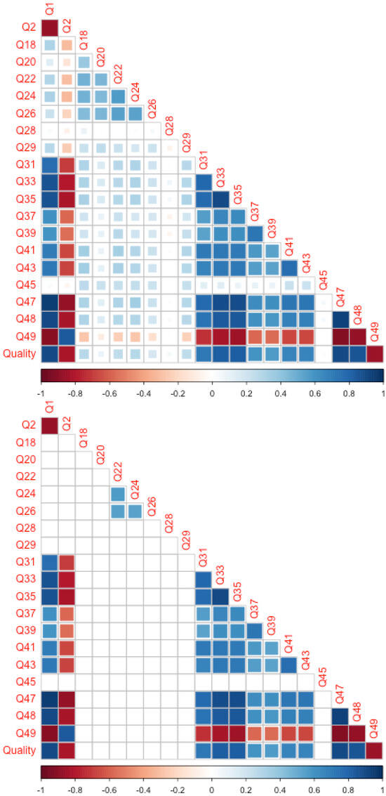 Figure 3. Original (top) and pruned (bottom) correlation matrices. The size of the square, as well as the color, reflect the correlation (range: −1, +1).