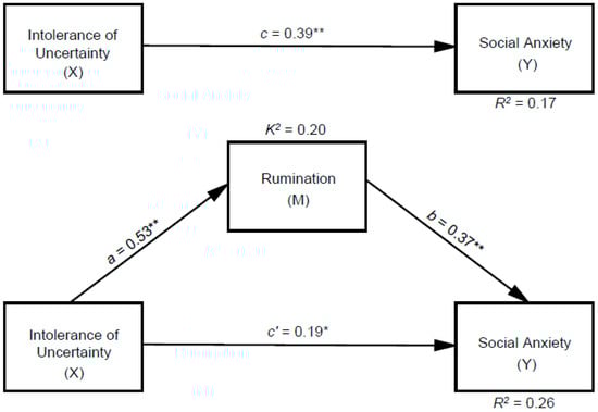 An additional parameter to consider when evaluating the hypothetical mediation model is the completely standardized effect size (K2). Table 2 presents the values related to effect size for the significant mediation observed between intolerance of uncertainty and social anxiety through the hypothesized mediator, rumination. An examination of Table 2 indicates that the effect of rumination in the proposed mediation model is large (K2 = 0.20).