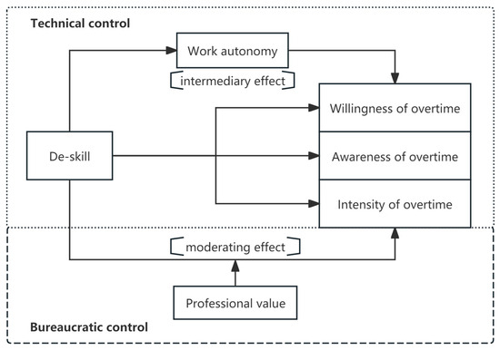 Figure 1 illustrates the main concepts and ideas of this study. Independent variable de-skilling refers to the weakening of employees’ skills in the work process. The overtime behavior as a dependent variable is subdivided into three dimensions: willingness to work overtime, overtime cognition, and overtime intensity. The willingness to work overtime is the psychological tendency of employees to work overtime, overtime cognition is the perception of employees in working overtime, and overtime intensity indicates the degree of overtime work relative to the length of overtime work. Work autonomy as a mediating variable refers to the extent to which employees can make decisions and organize their work methods and schedules. The occupational value as a moderating variable refers to the employee’s comprehensive evaluation of the fulfillment, social status, and financial rewards of their occupation. The technological control context emphasizes the control of the labor process through de-skilling, while the bureaucratic control context focuses on managerial control through institutions and hierarchical structures.