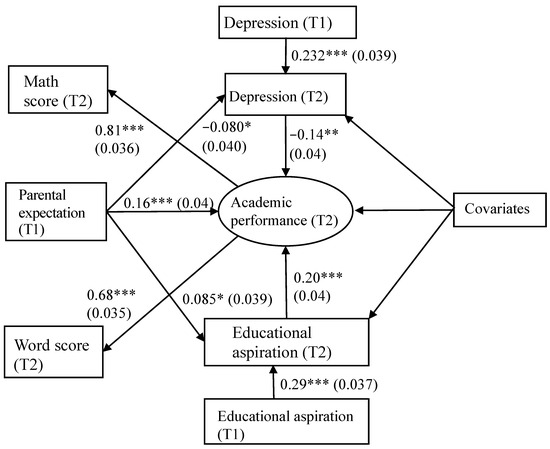 Descriptive statistics and correlations among variables are shown in Table 2. Rural students’ academic performance at Time 2 positively correlates with caregiver expectation (r = 0.17) at Time 2, students’ educational aspiration (r = 0.21) at Time 2, and father’s education level (r = 0.23) at Time 1, while negatively correlates with their depression (r = −0.13) at Time 1. Caregiver expectation at Time 1 is negatively associated with adolescents’ depression (r = −0.11) and positively correlates with their educational aspirations (r = 0.14) at Time 2. Rural adolescents’ depression is negatively correlated with their educational aspirations (r = −0.09), both at Time 2.