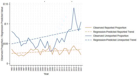 Next, we applied the Cochran–Armitage trend test to validate linear trends and detect deviations from linear patterns. For sexual victimizations, regression analyses showed a slight increase in the proportion of reported cases (B = 0.000, p < 0.001; β = 0.436) in addition to an increase in unreported cases (B = 0.001, p < 0.001; β = 0.499). This visualization is presented in Figure 1.