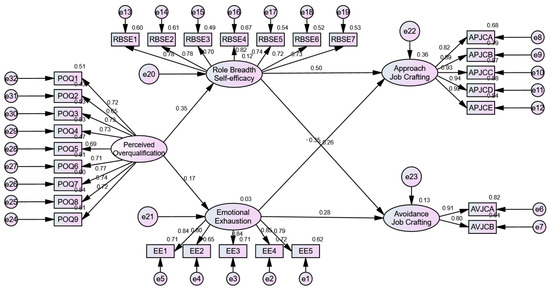 Subsequently, for the analysis of mediation effects, the random sampling was set by this study to 5000 iterations, and the Bootstrap mediation test procedure in AMOS 24.0 was utilized, with the results presented in Table 5. For approach job crafting, role breadth self-efficacy (RBSE) significantly mediated the relationship between perceived overqualification (POQ) and approach job crafting [β = 0.174, CI (0.129, 0.228), excluding zero], thereby supporting Hypothesis H1b. Emotional exhaustion (EE) also exerted a significant mediating effect in the relationship between POQ and approach job crafting [β = −0.060, CI (−0.111, −0.021), excluding zero], confirming Hypothesis H2b. The total indirect effect of POQ on approach job crafting through RBSE and EE was statistically significant [β = 0.085, CI (0.053, 0.120), excluding zero]. These results demonstrate that RBSE and EE act as dual mediators between POQ and approach job crafting, with the overall indirect effect being positive. This indicates that the cognitive pathway (via RBSE) dominates over the affective pathway (via EE) in shaping approach behaviors.