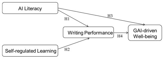 In this evolving learning context, individual learner characteristics have become increasingly salient. Specifically, AI literacy and SRL have been identified as two critical competencies that enable students to effectively engage with GAI tools. However, while both AI literacy and SRL have been independently linked to academic outcomes, a few studies have examined their combined effects—particularly on writing performance and GAI-driven well-being. Moreover, existing research tends to treat these variables in isolation or through linear models, with limited attention to how they might function synergistically in AI-enhanced learning processes. Although AI literacy reflects students’ technological competencies and SRL reflects their strategic learning behaviors, they may together relate to not only cognitive outcomes such as performance but also affective outcomes such as digital well-being. To date, the interrelationships among AI literacy, SRL, writing performance, and GAI-driven well-being have not been systematically examined. To address these gaps, the present study develops and tests a conceptual model that integrates AI literacy and SRL to investigate their joint influence on university students’ writing performance and digital well-being in GAI-supported academic settings. Drawing on theories of SRL (Zimmerman & Schunk, 2001), AI literacy (Ng et al., 2021), and the dialectical impacts of GAI on well-being (Shahzad et al., 2024; Cambra-Fierro et al., 2025), this study proposes a mediated model in which writing performance serves as a mechanism through which learner competencies influence psychological outcomes.
