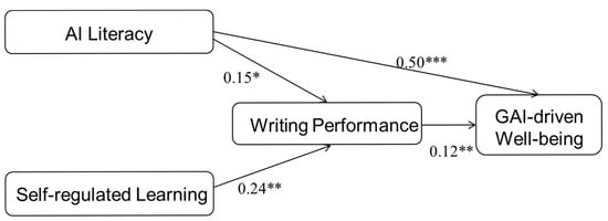As Table 3 shows, the path analysis revealed that both AI literacy and SRL were positively associated with writing performance, with SRL being the stronger predictor. AI literacy (β = 0.153, p < 0.05) and self-regulated learning (β = 0.237, p < 0.01) were significantly linked to writing performance. Furthermore, AI literacy was positively associated with GAI-driven well-being (β = 0.503, p < 0.001), indicating that learners with higher AI literacy tended to report higher digital well-being in GAI-supported environments. Writing performance was also positively associated with GAI-driven well-being (β = 0.120, p < 0.01). These results support the hypothesized model and demonstrate that both AI literacy and SRL strategies are important correlates of students’ writing performance and well-being in the context of GAI-assisted learning.