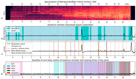 For instance, there are well-timed inspirations (active phase of quiet breathing) before many low strings entries and phrase beginnings (Figure 1c and Figure 2a,b). In the excerpt of Figure 2a without any active expiration phase, this audience member’s inspirations were timed to allow expirations with the beginning of these lines that start on downbeats against the melody pickup (T1, T2) between rehearsal number 9 and 11. The trumpet fanfare before 11 cues the bass’s entry before T2. Excerpt 12–14 (130–170 s, Figure 2b) shows continued expiration alignment to accompaniment onsets and a large respiratory disruption (augmented breath) directly following the trumpet fanfare cue for a section that introduces more complex arrangement of melodic content partially shared with the basses (13). In Figure 2c, this audience member’s expirations shift and align with the bass part pickup rather than the downbeats. An audience member aligning expiration onsets with this handful of bass part entries is a possible coincidence, but this is unlikely, and not a shared with any other audience members at this performance (see Supplementary Materials).