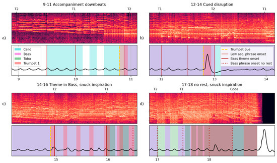 Four 40 s excerpts of performance audio and audience member respiration from Case Study 1, with instrument parts and event annotations from Figure 1c,d overlayed on the respiration wave. (a) Excerpt rehearsal numbers 9–11 (79–119 s) show the solo cello entry going into the low strings playing accompaniment and audience member inspirations preceding bassline phrase onsets. (b) Excerpt 12–14 (130–170 s) shows a large respiratory disruption (rapid augmented inspiration) directly following the trumpet fanfare cue for a section that introduces a more complex arrangement of melodic content partially shared with the basses (13). (c) Excerpt 14–16 (170–210 s) shows thematic statements when the basses are playing the melody, again with one phrase (15) cued by a trumpet fanfare. (d) Excerpt 17–18 (215–255 s) shows more instances of disrupted inspiration through the final theme’s bombastic theme statements, including bass and tuba passages performed fff that do not pause for breaths as often as a tuba player might need.