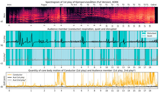 The full Case Study 2 measurements and performance audio from KORK’s first performance of ‘Kjempeviseslåtten’ with annotations, *signals warped to first performance time. (a) Constant Q-transform spectrogram of a professional stereo audio recording of the orchestra, as in Figure 1. Above are structure markers including meter changes and theme onsets, and below are rehearsal numbers according to the full score. (b) The full respiratory wave of this case study audience member during the first performance (with conductor), categorised as in Figure 1b. (c) The full respiratory wave by this same audience member during the second play of ‘Kjempeviseslåtten’, with breaths categorised as in Figure 1b and plotted with time warped to align with the first performance. (d) Three quantity of motion measurements (core body jerk magnitude): the performing conductor during the first play, this audience member during the first play, and this audience member during the second play with time values warped like in (c).