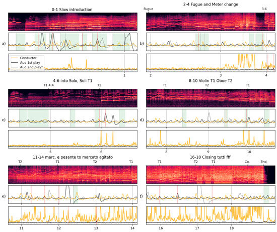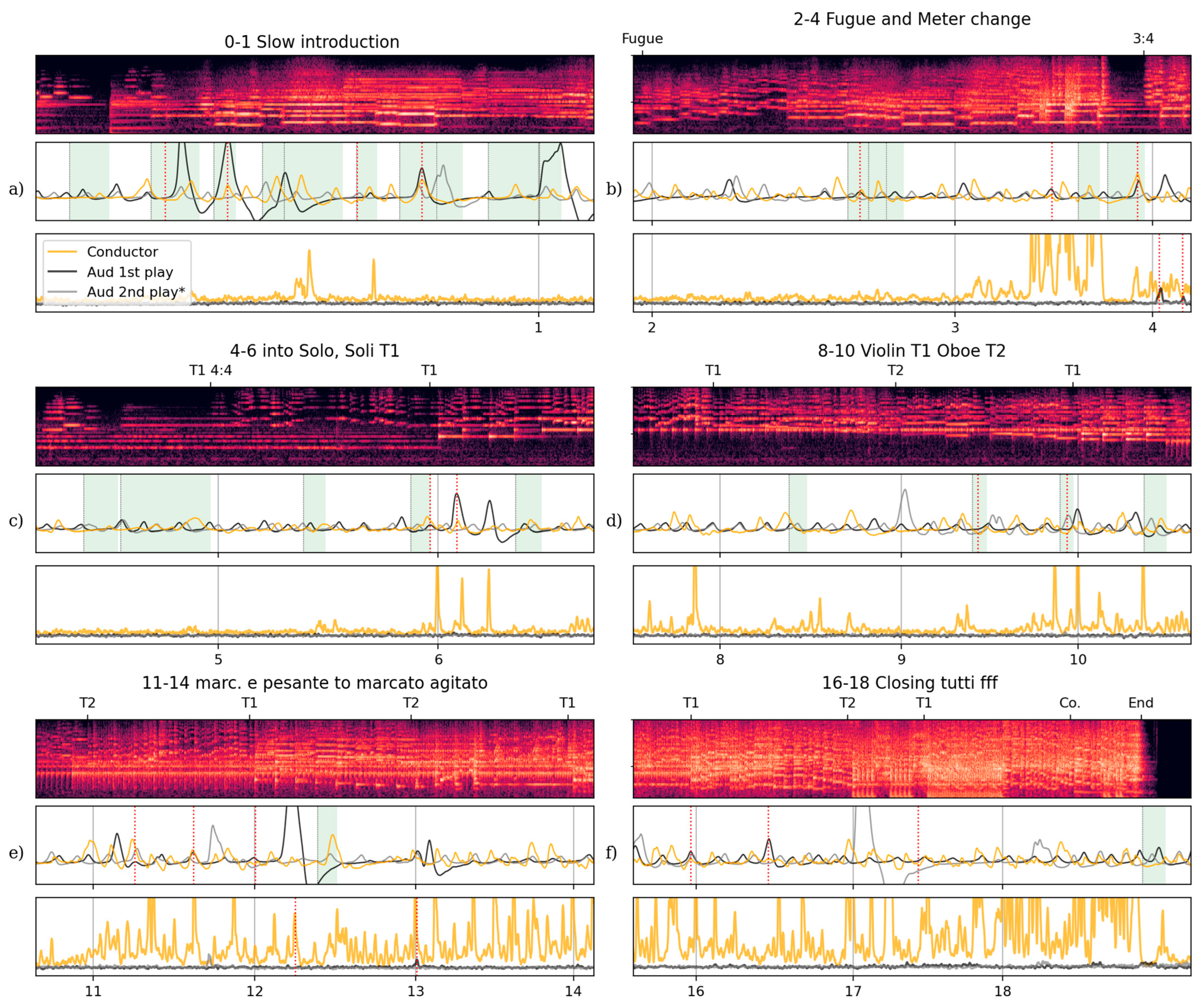 Six 60 s excerpts of performance audio, audience member and on-stage conductor respiration waves, and audience member and conductor quantity of motion, with additional annotations. (a) Excerpt 0–1 (15–75 s) from the slow introduction with green highlighting behind the respiration waves indicates held passages: intervals without new onsets and dotted red vertical lines indicate salient coincidences between the physiological measurements of the audience member and the on-stage conductor. (b) Excerpt 2–4 (109–169 s) shows the short fugue section and shift to 3/4 m with more held passages in green. (c) Excerpt 4–6 (185–245 s) shows the stillness going into the theme and variations, first played by solo viola and violin, then by full sections from 6. (d) Excerpt 8–10 (260–320 s) themes in variation, with the oboist playing the theme in 9–10. (e) Excerpt 11–14 (320–380 s) shows theme statements that vary in texture and expression with the Marcato agitato starting at 13. (f) Excerpt 16–18 (405–465 s) shows the closing section of this piece with near-tutti theme statements.