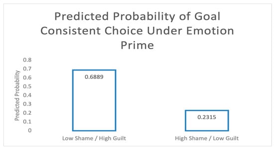 To illustrate these moderating effects, I plotted the predicted probabilities derived from Process Model 3 (Hayes, 2012). More specifically, I visualized the conditional effects of emotion prime (shame vs. guilt) at two key moderator points: low shame and high guilt proneness and high shame and low guilt proneness. Figure 1 shows model-estimated probabilities under these two key combinations of the moderators. The predicted probability of making a goal-consistent choice in the Low Shame/High Guilt condition was 0.69 (p = 0.03), whereas in the High Shame/Low Guilt condition, it was 0.23 (p = 0.02). These predicted probabilities highlight that guilt proneness promotes goal-consistent behavior under emotional priming, whereas shame proneness hinders it.
