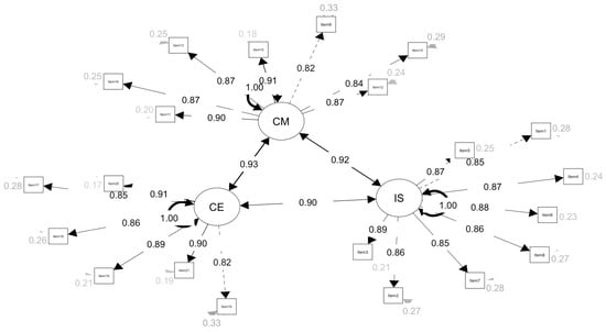 Factor Structure of Model 3 (three-factor model) for the SCPTSE, with standardized parameters. Note. IS: self-efficacy for instructional strategy; CM: self-efficacy for classroom management; CE: self-efficacy for child engagement.