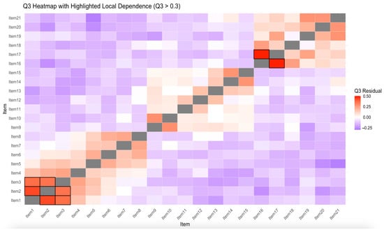 Q3 heatmap with highlighted local dependence. Note. Item pairs with Q3 values greater than 0.3 are highlighted with bold-bordered red cells, indicating potential local dependence.