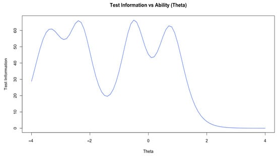 Finally, Table 3 reports the discrimination parameters (a) for the 21 items, four level difficulty parameters (b1, b2, b3, b4), and the item information function mean value of each item (IIFM). Figure 2 displays the test information function curve for the ability interval [−4, 4]. In the discrimination analysis, the mean of a-parameter across the 21 items is approximately 3.557. All items have discrimination parameters exceeding the commonly acceptable standard (all > 1.7), reaching an excellent level, indicating these items are highly effective in distinguishing varying levels of self-efficacy among preschool teachers. The difficulty parameters fall within the expected range of [−4, 4]. Specifically, the average values of the difficulty parameters are as follows: b1 = −3.443 (range: −3.815 to −3.003), b2 = −2.334 (range: −2.590 to −2.037), b3 = −0.503 (range: −0.828 to −0.295), and b4 = 0.771 (range: 0.316 to 1.155). Although the overall difficulty is relatively low, particularly for b1, the consistently increasing pattern (b1 < b2 < b3 < b4) indicates a well-structured design that effectively differentiates performance across various ability levels.