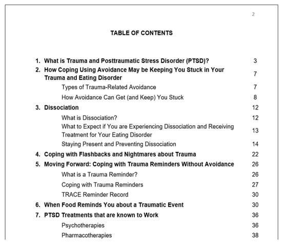 Table of Contents for “Cognitive–Behavioural Tools to Help You Move Forward in Recovery from Your Eating Disorder and Trauma”.
