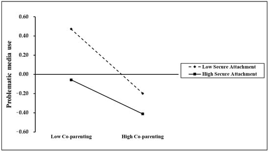 For a clearer interpretation of the interaction, secure attachment was split into high (+1 SD) and low (−1 SD) groups, followed by simple slope tests to assess the moderation effects. As shown in Figure 2, for the preschoolers with higher secure attachment (+1 SD), co-parenting significantly negatively predicted problematic media use (simple slope = −0.27, p < 0.01); whereas for those with lower secure attachment (−1 SD), co-parenting demonstrated a stronger negative predictive effect on problematic media use (simple slope = −0.52, p < 0.001), indicating that the negative association between co-parenting and preschoolers’ problematic media use intensifies as secure attachment levels decrease. The results indicated that the negative association between co-parenting and problematic media use was stronger among children with lower secure attachment, which supported the presence of a significant moderation effect of secure attachment.