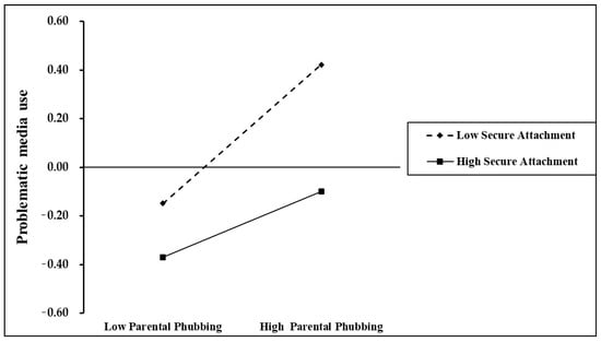 Simultaneously, a simple slope analysis was conducted to examine secure attachment’s moderating role in the relationship between parental phubbing and preschoolers’ problematic media use. As illustrated in Figure 3, parental phubbing significantly positively predicted the preschoolers’ problematic media use with high secure attachment (simple slope = 0.23, p < 0.001); whereas the positive predictive effect was stronger for the low-secure attachment preschoolers (simple slope = 0.49, p < 0.001), indicating that parental phubbing exerts a greater positive influence on problematic media use for preschoolers with lower versus higher secure attachment. The stronger association in the low-attachment group indicated that insecurely attached children were more adversely affected by parental phubbing. This pattern further supported the moderating effect of secure attachment, highlighting its buffering role against parental phubbing. And these findings further supported H3, confirming secure attachment’s role in mitigating the adverse effects of poor co-parenting and parental phubbing, aligning with attachment theory’s protective mechanism.