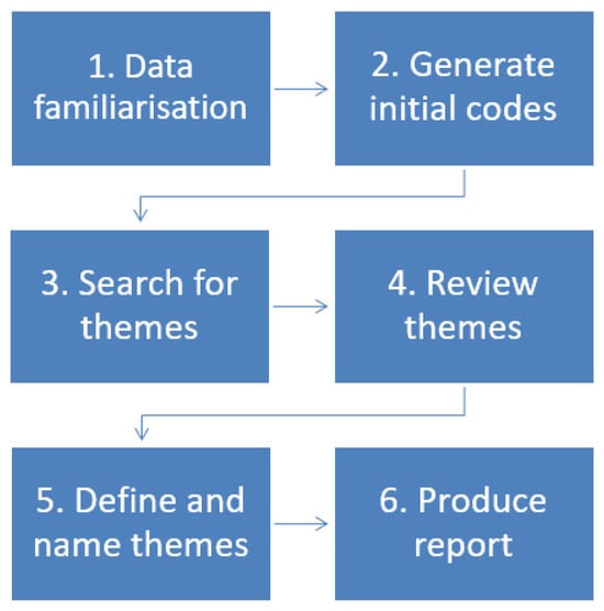 Thematic analysis uses a six-phase approach, as shown in Figure 1 (familiarisation with the data, generating codes and initial themes, reviewing the themes, defining the themes, and writing up) as outlined by V. Braun and Clarke (2006). This was the process followed by this study, as discussed further in Section 3.4 below.