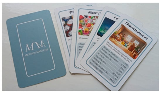 A card game, called Metrics Masters©, was developed based on the popular game Top Trumps©, using real data from 160 anonymised companies from the London Financial Times Stock Exchange (FTSE) across a range of industries. Each company was depicted on a card, with a fictitious company name, an eye-catching picture to illustrate the company, brief information about the industry and the date of incorporation of the company, and a selection of eight metrics across a range of accounting and business measures, both financial and non-financial. Figure 2 shows examples of the cards.