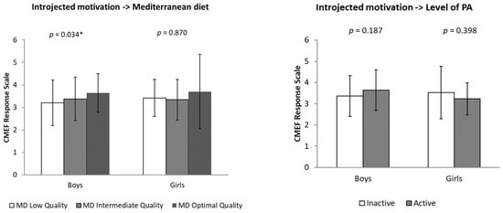 In terms of introjected motivation, significant differences were found only in the boy group (p = 0.034), where boys with optimal adherence to MD showed higher levels of this motivational dimension than those with low adherence. No significant differences in introjected motivation were found in the girl’s group.