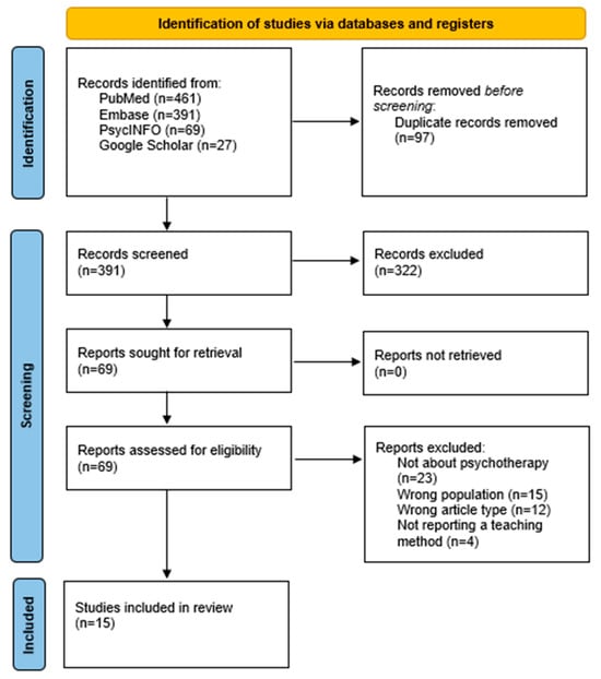 The present scoping review explored the best practices for teaching psychotherapy to medical students. An initial search across the four databases yielded 948 records. After the removal of 97 duplicate entries, 391 records were screened based on their titles and abstracts. From this initial screening, 322 records were excluded for not meeting basic inclusion criteria. A total of 69 full-text articles were then assessed in detail for eligibility. Of these, 54 were excluded for the following reasons: the article was not focused on psychotherapy (n = 23), involved the wrong population (n = 15), was of an ineligible article type such as letters or book chapters (n = 12) or did not describe a teaching method (n = 4). This screening process resulted in 15 studies being included in the final review. A detailed flowchart of the selection process is presented in Figure 1, and a full list of included studies can be found in Table 1.