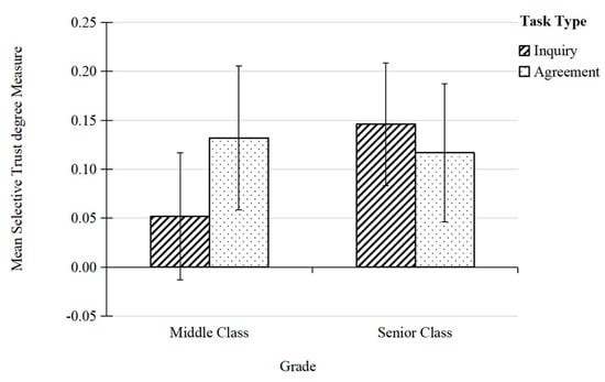 The results showed that the interaction effects of task type, gender, and grade were not significant, F (2, 163) = 0.229, p = 0.795; the interaction effect of task type and gender was not significant, F (1, 163) = 1.45, p = 0.23; the interaction effect of task type and grade was not significant, F (2, 163) = 0.439, p = 0.645; and the interaction effect of gender and grade was not significant, F (2, 163) = 1.322, p = 0.27. The results indicate that the development of selective trust towards reward-giving teachers among preschool children of different genders and grades is consistent. The main effect of task type was not significant, F (1, 163) = 0.121, p = 0.729, suggesting that there was no significant difference in the degree of selective trust towards reward-giving teachers between inquiry and agreement tasks among preschool children, indicating that teacher rewards have a certain effect on preschool children’s selective trust. The main effect of gender was not significant, F (1, 163) = 1.012, p = 0.316, indicating that there was no difference in the degree of selective trust towards reward-giving teachers among children of different genders. The main effect of grade was significant, F (2, 163) = 3.817, p = 0.024 < 0.05, η p 2 = 0.045. Further multiple comparisons (LSD) revealed that the selective trust degree of children in the junior class towards reward-giving teachers was significantly higher than that of children in the senior class (p = 0.02 < 0.05), while there were no significant differences between junior- and middle-class children (p = 0.051) and between middle- and senior-class children (p = 0.728). This suggests that children in the junior class are more sensitive to the rewards of teachers than those in the senior class. Based on this, we also supplemented the analysis with a more stringent method. The results of the multiple comparisons (Bonferroni) showed that there were no significant differences in the trust levels of children from the senior, middle, and junior classes towards teachers who provided rewards (senior vs. middle class: p > 0.999, senior vs. junior class: p = 0.06, middle vs. junior class: p = 0.154).