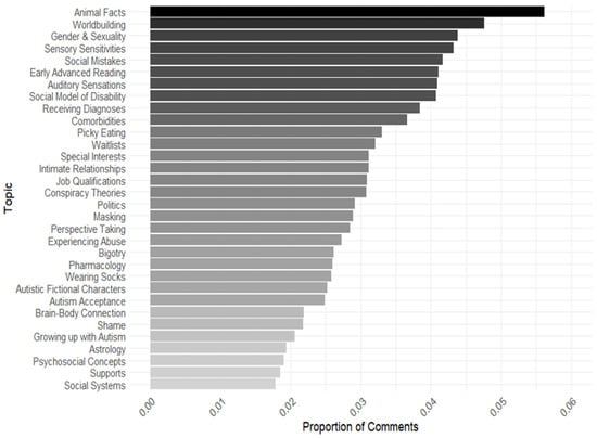 We first calculated the anticipated proportions of topics to identify which ones constituted the highest expected proportion within the comments. First, for our autism topic model, expected topic proportions ranged from 0.02 to 0.06 (Figure 1). The topic that comprised the greatest proportion of comments and had the greatest expected topic proportion for the autism subreddits was “Animal Facts” (expected topic proportion = 0.06). This topic consisted of users sharing detailed information about types of animals, animal genetics, and favorite types of animals. The topic that made up the lowest expected topic proportion in the autism model was “Social Systems” (expected topic proportion = 0.02), which contained conversations about the social behavior of humans and other animals.